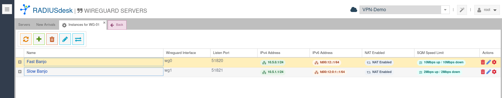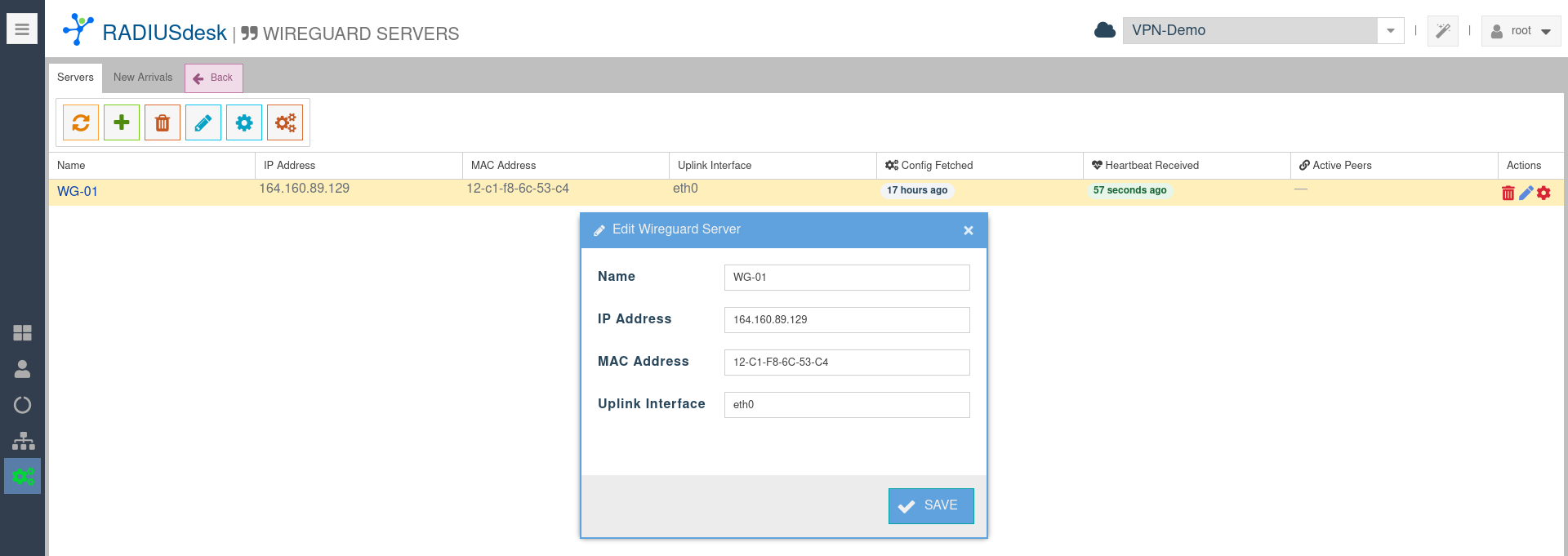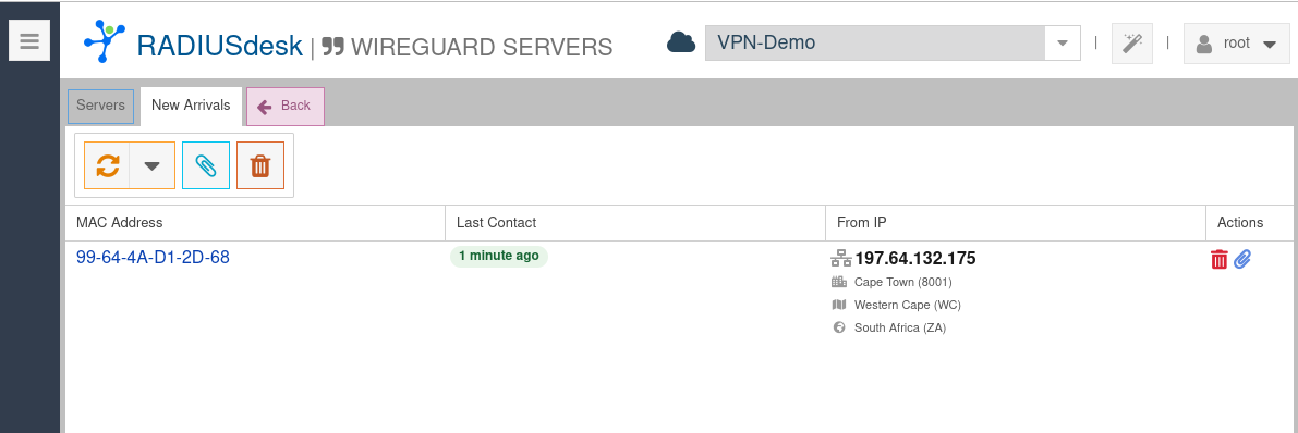 - The New Arrivals lists Wireguard servers that reported to RADIUSdesk but which require on-boarding.